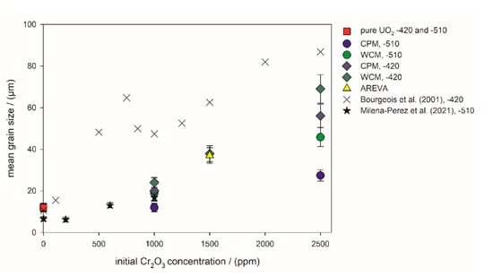 The mean grain sizes obtained in this study and the available literature data are compiled in Figure 6. The data from the present wet chemical syntheses show a systematic shift in the average grain size toward larger grains, resulting from the variation of oxygen potential to lower values. In general, the samples prepared at −510 kJ/mol O2 exhibited a lower grain size than the corresponding samples sintered at −420 kJ/mol O2. The grains of the WCM samples were systematically larger than the grains of the CPM samples. The AREVA pellet had an identical average grain size as the WCM sample initially doped with 1500 ppm Cr2O3 and sintered at −420 kJ/mol O2. Compared to the pure UO2 sample, the addition of 1000 ppm Cr2O3 only had minor effects on the average grain size for the samples sintered at −510 kJ/mol O2, and a more pronounced effect at −420 kJ/mol O2 (Figure 6).