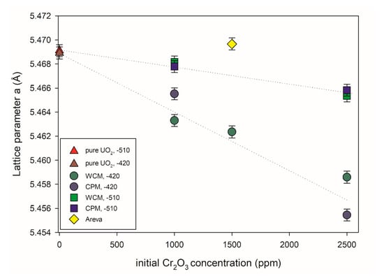 The effect of the doping method on the structural uptake appears to play no significant role depending on the oxygen partial pressure. In the case of −510 kJ/mol O2, no discernible difference could be observed between the different doping methods used with increasing Cr initial addition. At higher oxygen partial pressure, slight differences could be observed between the lattice parameter when using the different doping methods. At 1000 ppm Cr2O3 (i.e., below the solubility limit), WCM led to a greater contraction and presumed higher incorporation of Cr, whereas at 2500 ppm Cr2O3 (i.e., above the solubility limit of Cr), CPM led to greater contraction and presumed higher incorporation of Cr. A mechanistic understanding was beyond the scope of the present investigation, nevertheless, it can be readily observed that the doping methods and controlled oxygen partial pressure greatly assist in incorporation into the UO2 matrix as opposed to the sample produced by AREVA via powdering mixing routes where its doping of 1500 ppm Cr2O3 seemed to have little effect on the UO2 lattice and it is argued that the matrix contains little Cr.