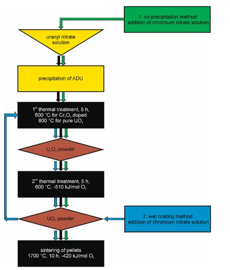 The preparation was adapted from the general procedure of [28] for the wet chemical preparation of ammonium di-uranate ((NH4)2U2O7, ADU) from uranyl nitrate solution. The main steps: (1) powder preparation; (2) Cr-doping; and (3) preparation of ceramic pellets and their optimization, are described in detail below. Two different methods for the chromium doping of the pellets were applied: (1) a co-precipitation method (CPM) and (2) a wet coating method (WCM) as adapted from [29,30,31].