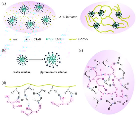 (a) Polymerization and the structure of HAGx hydrogels. (b) The association of the micelles in water and glycerol/water solution. (c) Hydrogen bonds between water and glycerol. (d) Hydrogen bonds between HAPAA and glycerol.