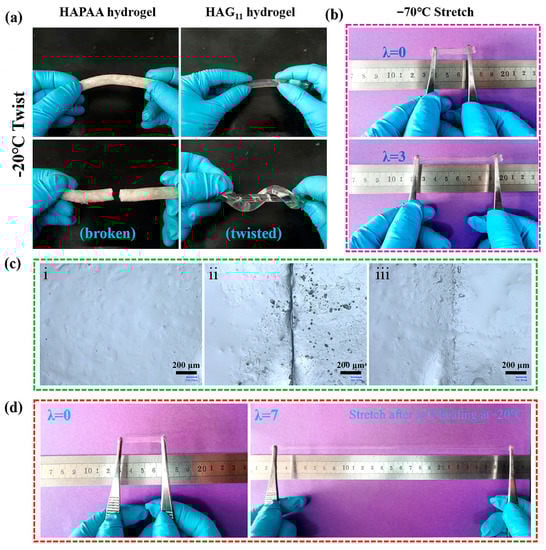 (a) Photos of the twisted HAPAA and HAG11 hydrogels at −20 °C. (b) The original and stretched HAG11 hydrogel at −70 °C. (c) Microscope images of HAG11 hydrogels: (i) original, (ii) cutting off and being contacted immediately, and (iii) self-healing for 3 days at −20 °C. (d) Photos of the original and the self-healed HAG11 hydrogels for 3 days at −20 °C.