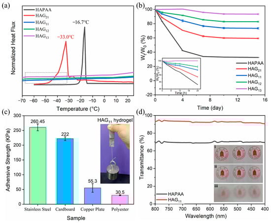 (a) DSC curves of HAPAA and HAGx hydrogels. (b) The water-retention of HAPAA and HAGx hydrogels with a testing time lasting for 15 days. (c) The adhesive strength of the HAG11 hydrogel to different sample plates. The inset image shows the bonded plates of stainless steel lifted a weight of 1 kg. (d) The transmittance of HAPAA and HAG11 hydrogels with a thickness of 2 mm. The inset images are (i) a real photo directly taken by a mobile phone, (ii) a photo taken by a mobile phone with the phone lens covered by HAG11 hydrogel, and (iii) a photo taken by a mobile phone with the phone lens covered by HAPAA hydrogel.