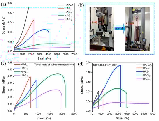(a) Stress–strain curves of HAPAA and HAGx hydrogels. (b) The HAG12 hydrogel can be stretched to more than 6000%. (c) The stress–strain curves of HAPAA and HAGx hydrogels after 24 h storage at −20 °C. The tests were done immediately after the hydrogels were taken out. (d) The stress–strain curves of the healed HAPAA and HAGx hydrogels after 24 h at room temperature.