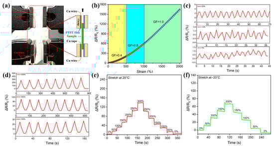 (a) The test method for the strain sensor based on the HAG11 hydrogel. (b) The relative resistance changes of the HAG11 hydrogel. (c,d) The relative resistance changes from small strains to big strains. (e,f) The relative resistance changes upon different strains at room temperature and −20 °C, respectively.