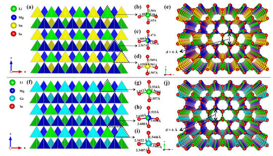 The DL structure of Li2MgSnSe4 (a) and Li2MgGeSe4 (f) on the ac plane; (b–d,g–i) The structures of [LiSe4], [(Li/Mg)Se4], [SnSe4] and [GeSe4] tetrahedral units. The channel-like structures of Li2MgSnSe4 (e) and Li2MgGeSe4 (j) on ab plane.
