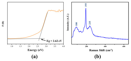 Based on the UV–Vis–NIR diffuse-reflectance spectrum, the experimental band gap of Li2MgSnSe4 was determined to be 2.62 eV (Figure 2a). To confirm chemical bonding, the Raman spectrum of Li2MgSnSe4 was characterized on a single crystal. As shown in Figure 2b, the peaks below 193 cm−1 are related to the vibrations of Li-Se and Mg-Se bonding, matched with the previous results [47,48,49]. The peak at 193 cm−1 and the overlapping peaks around 235 cm−1 could be assigned to the asymmetric and symmetric stretching vibrations of Sn-Se bonding in SnSe4 tetrahedral groups [49,50].