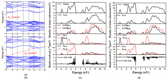 To detect the origin of the optical properties, the electronic structures, SHG densities and band-resolved NLO susceptibilities of Li2MgMSe4 (M = Ge, Sn) were further investigated. Figure 3 shows the calculated band structures, total and partial density of states and the band-resolved NLO susceptibility χ(2) of the two compounds. The band structures (Figure 3a,b) indicate that Li2MgGeSe4 is an indirect band gap compound with a band gap of 2.44 eV, while Li2MgSnSe4 is a direct band gap compound with a band gap of 2.42 eV (matched with the experimental value of 2.62 eV). Furthermore, as shown from the total and partial density of states (PDOS) curves (Figure 3c,d), the valence bands maximum (VBM), which, around the Fermi level, is mainly occupied by Se-4p (83%) orbitals with the minor contribution of Sn-5p (8%), Li/Mg-2p (5%) and Li-2s (4%) orbitals for Li2MgSnSe4 and Se-4p (83%) orbitals with the minor contribution of Ge-4p (8%), Li/Mg-2p (5%) and Li-2s (4%) orbitals for Li2MgGeSe4, respectively (the range from -4.0 to 0 eV). The conduction bands minimum (CBM) originates from Se-4p (10%), Sn-5p (9%), Li-2s (19%) and Li/Mg-2p (21%) orbitals for Li2MgSnSe4, Se-4p (11%), Ge-4p (8%), Li-2s (17%) and Li/Mg-2p (21%) orbitals for Li2MgGeSe4, respectively (the range from 2.4 to 12 eV). The results indicate that the optical band gaps of Li2MgMSe4 (M = Ge, Sn) are mainly determined by the Se-4p, Li/Mg-2p and Li-2s orbitals.