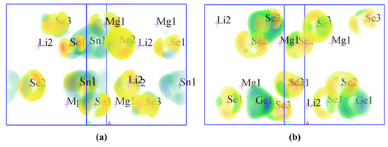 Figure 4 shows the calculated SHG densities for the two compounds. Combined with the band-resolved NLO susceptibility χ(2) in Figure 3c–d, the SHG responses of Li2MgMSe4 (M = Ge, Sn) can be mainly derived from the [MSe4] (M = Ge, Sn) tetrahedra units and with minor contributions from [LiSe4] and [(Li/Mg)Se4] groups.