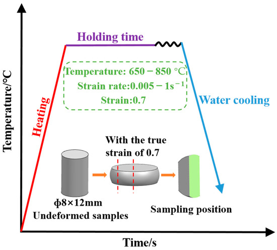 The sample was selected in the axial direction. The samples were analyzed by Shimadzu 7000 X-ray diffraction (XRD, Shimadzu, Kyoto, Japan). The scanning angle was from 20° to 90°and the scanning speed was 8°/min. The equipment type of EBSD was GeminiSEM-300 (Carl Zeiss, Jena, Germany). The experimental step was 2 μm and the voltage was 20 kV. The samples were observed in JEM-2100 transmission electron microscope (TEM, JEOL, Tokyo, Japan) and Hitachi S-3400N scanning electron microscope (SEM, Hitachi, Kyoto, Japan). The constituent of the corrosive medium was H2O:HNO3:HF = 10:2:1. Moreover, the TEM sample was prepared by the Tenupol-5 double jet equipment (Struers, Shanghai China), and the reagent was CH3OH:HNO3 = 3:1. The experiment was conducted at a potential difference of 20 V and −20 °C.