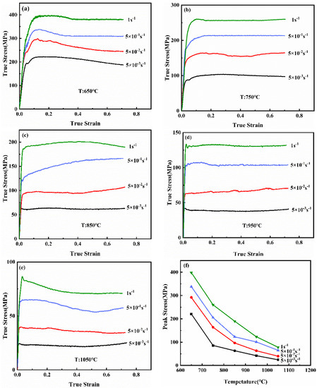 True stress-strain curves of the NiTi alloy at different deformation conditions. (a) 650 °C; (b) 750 °C; (c) 850 °C; (d) 950 °C; (e) 1050 °C; (f) Peak stress.