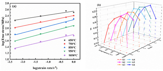 The sensitivity exponent of the strain rate is an important parameter which reflects the thermoforming property of the alloy. The larger value of m is, the better the formability of the alloy is. From the discussion in Section 3.1, the NiTi alloy belongs to materials that are sensitive to the strain rate. Figure 3a shows the variation of the m value at 650 °C, 750 °C, 850 °C, 950 °C and 1050 °C with the strain of 0.4. The slope of the line represents the m value of the NiTi alloy. Figure 3b shows the m values of the deformation with the strain of 0.1–0.6 at different temperatures, as plotted in Table 2.