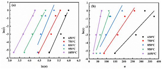 where, A, A1, A2, α, β are the constant, is the strain rate (s−1), σ is the flow stress (MPa), n and n1 are the stress exponents, Q is the activation energy (KJ/mol), R is the gas constant (J/(mol·K)), T is the deformation temperature (K). In Equations (4) and (5), A1 equals to Aαn1, A2 equals to A/2n and β equals to αn1. Equations (6) and (7) are obtained by the logarithmic transformation from Equations (4) and (5) respectively.
