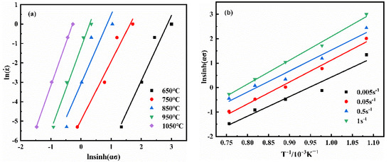 High-temperature deformation of the NiTi alloy is a hot activation process based on the energy dissipation and redistribution. The influence of parameters such as temperature, the strain rate and the degree of the deformation on the flow stress can be described by the Arrhenius hyperbolic sine function model [26,27], as shown in Equation (3). Under low stress level (ασ ≤ 0.8), sinh(ασ) is ασ, and under high stress level (ασ ≥ 1.6), sinh(ασ) is 0.5exp(ασ). Equations (4) and (5) are transformed form Equation (3).
