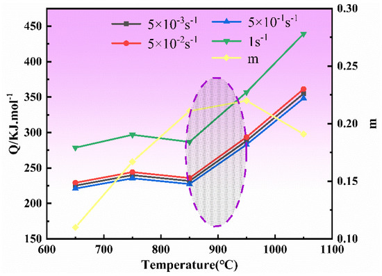 The activation energy Q represents the energy dissipation and redistribution of the material during the deformation process. Therefore, the Q value can truly reflect the change of the energy of the NiTi alloy. Figure 6 illustrates the relationship between the m value and the Q value of the NiTi alloy at the strain of 0.4, and it can be seen from Table 4 and Figure 6 that the Q value ranges from 220.98 KJ/mol to 439.31 KJ/mol. The inflection point of the Q value is 227.37 KJ/mol which appears at the deformation temperature of 850 °C. This phenomenon is mainly caused by the acute movement of the dislocation in the alloy with the increase of temperature, which is conducive to the formation of sub grain boundary and the large angle grain boundary. During the deformation process, the migration of large angle grain boundaries produces recrystallization, which is beneficial to the deformation and leads to the decrease of Q value. Based on the above analysis, the best formability of the NiTi alloy is obtained at 800–950 °C.