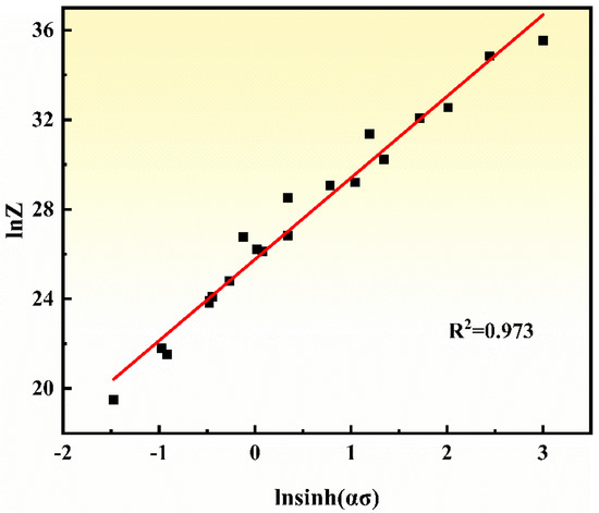 Zener-Hollomon parameter [30] can be used to characterize the relationship between the temperature and the strain rate, as shown in Equation (10). Equation (11) is obtained by the logarithmic calculation from Equation (10). Figure 7 illustrates the relationship between lnZ and lnsinh(ασ) at different temperatures and strain rates. Based on linear fitting analysis, the relationship between lnZ and lnsinh(ασ) of the NiTi alloy can be expressed by Equation (12), and the value of A is calculated as 1.556 × 1011.