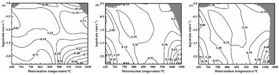 The processing maps for the NiTi alloy (a) ε = 0.2; (b) ε = 0.4; (c) ε = 0.6.