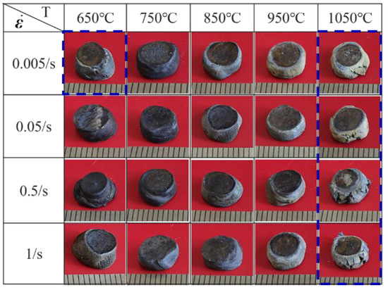 According to the above theory, the values of power dissipation factor η and flow instability criterion ξ are obtained. The hot-processing map of the NiTi alloy is plotted by combining power dissipation maps and instability maps, as illustrated in Figure 9. The hot-processing map can optimize the processing technology of materials and improve the workability of materials. Hot-processing maps can also be used to control the microstructure of materials, study the deformation mechanism, and analyze the instability region. In the hot-processing map of the NiTi alloy, the contour represents the power consumption coefficient, and the shadow part is the instability region. Figure 9 plots the instability region of the NiTi alloy, which increases with the increase of the strain. This is consistent with the existed conclusion [26,30,37]. When the strain is 0.2, the instability region of the alloy is mainly at 650 °C and 1050 °C under the high strain rate (1 s−1). With the increase of the strain, the instability region of the NiTi alloy gradually expands. When the strain is 0.6, the instability region of the alloy appears at 650 °C, 1 s−1 and 1000–1050 °C, 0.005–1 s−1, which is due to the deformation capacity of the alloy gradually decreasing with the increase of the strain at high temperature. In the stability region, the power dissipation η increases as the temperature increases or the strain rate decreases. The processing map shows that the formation process of NiTi is difficult at high strain rate (≥1 s−1), and the excellent forming performance is found at 800–950 °C. Figure 10 is the cracking diagram of hot deforming under different processing parameters, which illustrates that instability cracking occurs at 1050 °C, 0.005–1 s−1 and 650 °C, 1 s−1. At the deformation condition of 850–950 °C and 0.005–0.5 s−1, the smooth round cake-shape is specimen in the specimen after compression, and it can be concluded that the forming ability of the NiTi alloy at this condition is the best. Finally, the unstable region and the optimal processing region in the processing map are consistent with the experimental results.