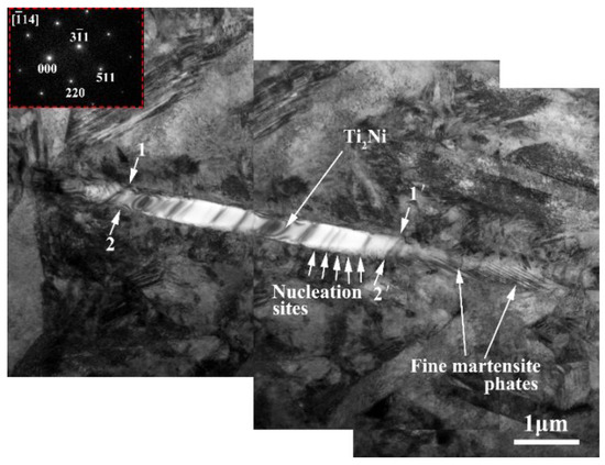 Figure 12 shows TEM analysis of Ti2Ni phase in the NiTi alloy at 650 °C and the strain rate of 0.005 s−1. Based on the analysis of the diffraction spot, it can be concluded that the precipitation phase in the NiTi alloy is mainly Ti2Ni phase with the crystal band axis [14] which is consistent with the XRD and EDS results. Thus, the existence of the Ti2Ni phase in the NiTi alloy is further confirmed. Furthermore, it can be clearly seen from the diagram that the compressed strip-like Ti2Ni phase is in a larger size, which is about 11 μm. A smooth spreading surface is found on 1–1′ and 2–2′ area of the Ti2Ni phase, as shown in Figure 12. These expansion planes are low-index crystal planes, which contribute to the nucleation of the martensitic phase [18,38]. The microstructure characteristics around Ti2Ni phase can be observed from the extended surface of the Ti2Ni phase, and the extended surface can provide nucleation sites for the nucleation and growth of the martensite phase.