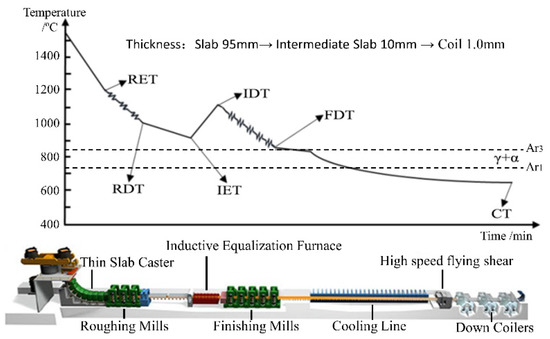 In ESP line, the thin continuous casting slab with 95 mm thickness after thin slab caster directly enters the roughing mills of three-stand high reduction mills and is rolled into intermediate slab with 10 mm thickness, which is then heated to about 1110 °C by inductive equalization furnace with a short distance of less than 12 m, and then rolled by five-stand finishing mills, after cooing line, high speed flying shear and down coiler, the coil with 1.0 mm thickness is obtained. The layout [5] and process diagram of ESP line is shown in Figure 1, in which, roughing mill entry temperature, roughing mill delivery temperature, inductive equalization furnace entry temperature, inductive equalization furnace inductive equalization furnace temperature, finishing mill delivery temperature, and coiling temperature are denoted by RET, RDT, IET, IDT, FDT, and CT, respectively.