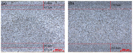 Figure 2 shows the full thickness microstructure of the transverse section. By comparing the microstructure of different C content, it can be seen that there are significant differences in the distribution of microstructure along the thickness direction and the grain size of ELC is slightly smaller than that of LC. The microstructure in the thickness direction of strip is non-uniform, the grain size distribution of ELC has five-layer structure, while that of LC has only three-layer structure. In Figure 2a the microstructure of ELC from the upper surface to the lower surface along the thickness direction includes an upper surface coarse grain area with a thickness of about 83.0 µm and an average grain size of 20.0 µm, a near upper surface fine grain area with a thickness of about 83.7 µm and an average grain size of 7.4 µm, a central medium grain area with a grain size of about 10.8 µm, a near lower surface fine grain area with a thickness of about 90.4 µm and an average grain size of 7.6 µm, and an lower surface coarse grain area with the thickness is about 85.5 µm and the average grain size is 17.5 µm. In Figure 2b the microstructure of LC includes an upper surface fine grain area with a thickness of about 159.6 µm and an average grain size of 7.1 µm, a central medium grain area with a grain size of about 10.3 µm, and an upper surface fine grain area with the thickness is about 162.4 µm and the average grain size is 6.8 µm.