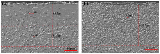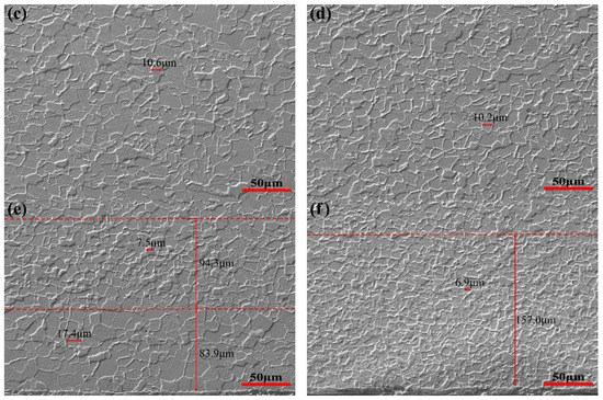 In order to further observe the difference of microstructure between ELC and LC, the SEM microstructures exhibited in Figure 3, consist of the ferrite and a few cementite distributed at ferrite grain boundaries or corners. In Figure 3a the microstructure of ELC includes an upper surface coarse grain area with a thickness of about 83.5 µm and an average grain size of 20.3 µm, and a near upper surface fine grain area with a thickness of about 81.7 µm and an average grain size of 7.2 µm. In Figure 3b the microstructure of LC includes an upper surface fine grain area with a thickness of about 159.6 µm and an average grain size of 7.1 µm. In Figure 3c,d the microstructure of ELC and LC is a medium grain area with average grain sizes of 10.6 µm and 10.2 µm, respectively. In Figure 3e the microstructure of ELC includes a lower surface coarse grain area with a thickness of about 83.9 µm and an average grain size of 20.3 µm, and a near upper surface fine grain area with a thickness of about 94.3 µm and an average grain size of 7.5 µm. In Figure 3f, the microstructure of LC includes an upper surface fine grain area with a thickness of about 157.0 µm and an average grain size of 6.9 µm. Compared with Figure 2, it can be seen that there is little difference in grain size and area thickness, which is mainly related to the magnification and the clarity of grain boundary.