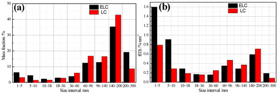 After the steel strips were corroded by the aqueous solution mixed with 10 g/L ammonium sulfate and 10 g/L citric acid, the particle size of precipitated particles obtained by filtration of the solution was analyzed by SAXS. The mass fraction distribution and mass density distribution under different particle sizes are obtained by SAXS, as shown in Figure 5. The mass fraction of less than 36 nm and >200 nm in ELC is greater than that of in LC, and the mass fraction of 36–200 nm is vice versa. The mass fraction is over 35% in 140–200 nm, the mean size of ELC is 136.3 nm, which is slightly more than 131.4 nm of LC, mainly because the mass fraction above 200 nm in ELC is 118% more than that in LC (Figure 5a). The mass density distribution has the same law as the mass fraction distribution, and the highest mass density is between 1–5 nm.