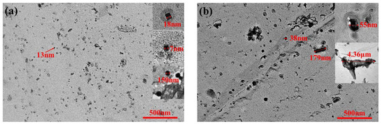 Relevant studies show that nanoscale oxide and sulfide precipitates had been observed in low carbon steel strips produced by CSP, and these small precipitates may contribute to the strengthening and grain refinement under certain conditions [11]. In low-carbon aluminum-killed steel, the second-phase particles frequently discovered are MnS, Al2O3, Fe3C and AlN [12,13]. The morphology and distribution of precipitates observed under TEM after carbon extraction replicas of ultra-thin strip produced by ESP are shown in Figure 6. It can be seen from the comparison that the precipitates of ELC are large in quantity and small in size, mainly square AlN, spherical Fe3C and Al2O3 (Figure 6a), while the precipitates of LC are small in quantity but large in size, mainly large size ellipsoidal MnS and rectangular AlN, in addition, lamellar pearlite with a length of 4.36 µm is observed at the corner of ferrite boundaries (Figure 6b). The result is consistent with Figure 5.