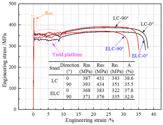 The engineering stress-strain curves and tensile properties of the two steels in rolling directions (0°) and transverse directions (90°) are shown in Figure 7. The initial yielding exhibits a material instability known as Lüders banding, which is a dislocation driven phenomenon that macroscopically manifests as inhomogeneous deformation. It exhibits an initial shape stress peak (upper yield stress) followed by a stress plateau (lower yield stress) that extends over a Lüders strain, it is called the discontinuous yield phenomenon. It can be seen that the upper yield strength (ReH) (see orange rectangular in Figure 7) of LC is more than 40 MPa higher than the tensile strength (Rm), while that of ELC is only higher than 5 MPa. Rm at 0° is about 5 MPa lower than Rm at 90°, the lower yield strength (ReL) at 0° is about 10 MPa lower than ReL at 90°. Each yield platform has obvious zigzag shape and the percentage yield point extension (see purple oval in Figure 7) or Lüders strain is about 10%, but the percentage yield point extension of low carbon steel produced by compact endless casting and rolling process is only 5% [14]. The elongation (A) at 0° is higher than A at 90°, in particular, A at 90° of ELC decreases significantly mainly because the percentage yield point extension reduced by 3%, which needs further study. On the whole, the strength other than ReH of ELC is about 20 MPa lower than that of LC and A of ELC is lower than that of LC. The longer yield platform of ESP steel strip is conducive to improve the elongation of the material and enhance the plasticity, but it also shows that the steel has room temperature aging and is not conducive to stamping forming [15]. Therefore, it is necessary to study the generation mechanism of yield platform and high ReH and their influence on forming properties.