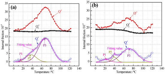 Because the Snoek relaxation can be used to study the distribution and variation characteristics of C and N atoms in the octahedral gap of ferrite, the internal friction method for measuring Snoek relaxation is a common analytical method for measuring the content of solid solution carbon atoms in iron and steel [17]. The internal frictions—temperature spectrums of ultra-thin hot rolled strip produced by ESP—are shown in Figure 8. is total internal friction measured by internal friction meter, is the real internal friction obtained by calculation, is the background internal friction deducted by the calculation software attached to the equipment, and the relationship between them is = + . Then, the peaks of were separated and fitted by OriginPro 8.5. It can be seen from Figure 8 that the real internal friction is composed of three internal friction peaks (P1, P2 and P3) and the peak value increases significantly with the increase of temperature. The peak temperatures of P1, P2 and P3 are about 20 °C, 40 °C and 70 °C, respectively. At the same time, the P2 peak shape and half width of LC are more obvious than those of LC. It can be inferred that there is an internal friction peak above 120 °C because the internal friction increases gradually when the temperature is higher than 100 °C. Relevant studies show that the Snoek peak of solid solution nitrogen atoms appears at about 20 °C [18,19], the Snoek peak of solid solution carbon atoms appears about 40 °C [19,20,21,22,23] or about 67 °C [15,20,24] and the activation energy is about 84 kJ/mol. In SDH3 steel, it is found [25] that the Snoek peak of solid solution carbon atoms is decomposed into two peaks, s1 and s2. The s1 peak is the Snoek peak of solid solution carbon atoms in pure α-Fe, and s2 peak is the Snoek peak of solid solution carbon atoms in body centered cubic lattice in which some Fe atoms are replaced by weak carbide forming elements such as Si and Mn. It is also found [20] that the internal friction spectrum of automotive plates with different stamping properties has obviously different characteristics with different peak numbers. According to these results, it can be preliminarily determined that the peak near 20 °C is the Snoek peak of solid solution nitrogen atoms, and the other two peaks are the Snoek peak of solid solution carbon atoms.