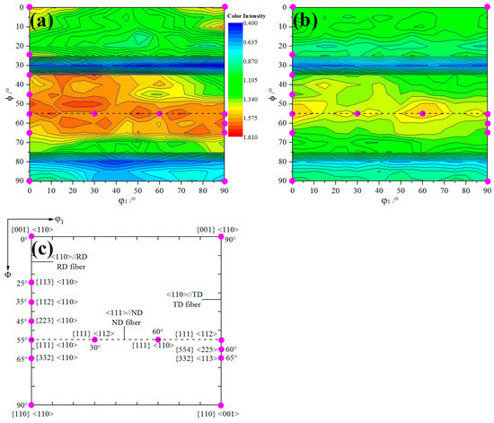 Orientation distribution function (ODF) section is the most representative section to reflect a series of important orientation positions. Figure 9 shows the φ2 = 45° sections of the ODF derived from XRD for 1.0 mm thickness strip with different carbon content. It can be seen that although the overall orientations are the same in the two ODF figures, which were mainly composed of incomplete α fiber texture parallel to the rolling direction (RD), incomplete γ fiber texture along the normal direction (ND) and partial fiber texture belonging to the transverse direction (TD). However, there are significant differences in the relative intensity of several important orientation positions such as {001} <110>, {113} <110> and {554} <225>.