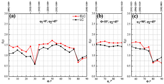 Figure 10 clearly illustrates the intensity distribution of textures on RD, ND and TD oriented lines. It can be seen that their texture distribution curves are similar and the intensity of ELC is obviously higher than that of LC except for {110} <110> and {110} <001>. On the RD oriented lines, ELC has five orientation positions with about 1.5 intensity, these indicate that ELC has a higher r value than LC, which is consistent with the results in Table 2. The intensity function value on the ND orientation line changes little, indicating that it is difficult to produce ear on the rolling direction of 0°/60°. However, the ELC intensity function values at {554} <225> and {332} <113> on the TD orientation line increase and those of LC decrease, indicating that ELC is more likely to produce ear on the rolling direction of 0°/60°, which can balance ear on the rolling direction of 45° and reduce the earing coefficient [30].