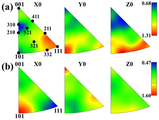 Although the texture was analyzed macroscopically by XRD, EBSD analysis was carried out along the thickness direction in order to obtain more detailed information about grain orientation. The IPF of main texture component for ELC and LC is shown in Figure 11, It can be seen that the density of {111}, {211} and {001} parallel to the rolling direction (X0) in ELC is higher than that in LC, the density of {111}, {211} and {001} parallel to RD (X0) in ELC is higher than that in LC, the density of {110} parallel to ND (Y0) in ELC is higher than that in LC, and the density of {111} and {332} parallel to TD (Z0) in ELC is higher than that in LC. The change trend is similar to that in Figure 10.
