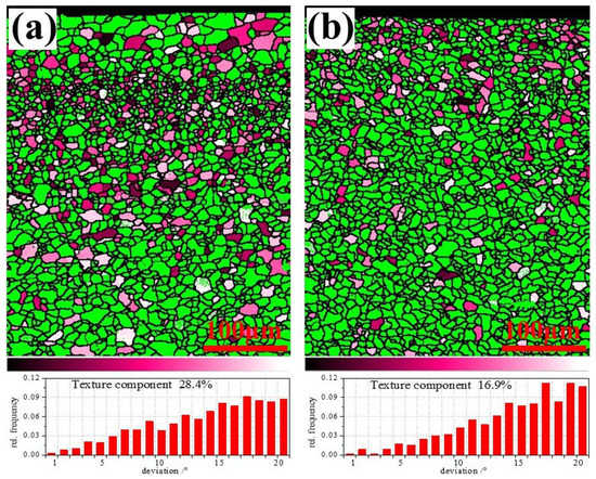 IPF of main texture component with different C content: (a) ELC, (b) LC.