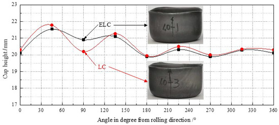 Several important indexes to characterize the earing propensity are listed in Table 5 in which t, v, e, Δhmax, and Ze meant the average height of ear peak, ear valley, earing, maximum ear height, and earing coefficient, respectively. Although Ze of both meets the user’s requirements of less than 5%, but, t, e, Δhmax, and Ze of ELC were lower than those of LC, so ELC has better earing performance than LC.