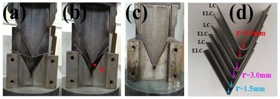 Figure 17 shows the V-shaped bending process and bending parts. The downward speed of the upper mold was 1 mm/s, holding for 30 s after reaching the specified position, and then the upper mold rises quickly, remove the sample and measure its angle. The measured angles were all 60° and the samples under different bending radium (1.5 mm, 3.0 mm, 6.0 mm) did not rebound, as shown in Figure 17d, and there were no obvious defects such as wrinkles on the appearance of the bended parts.