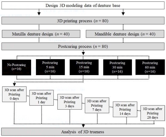 The designed STL format file was imported into the Nano DLP open-source slicing software (Nano DLP, Richmond Hill, ON, Canada), which was used to form a support structure to form and establish the 3D printing parameters. Before creating the support structure, the denture base was rotated 120 degrees from its forward direction to minimize contact with the gingival palatal part with support structure, because the palatal part was used for the 3D analysis. Each printing layer had a thickness of 100 μm and was cured for 15 s. The support structure was attached to the lingual side of the denture base without contacting the gingiva. For the support structure, a separate slicing program (Chitu DLP slicer Version 1.3.6, Shenzhen, China) was used, and the automatic function was used with a support density of 20%. After support alignment, manual support rearrangement was performed because of stable printing. The minimum height of the support structure is 5 mm, the attachment angle is 45 degrees, and the thickness of the support structure is 1 mm. This support structure was maintained during the postcuring progress and was removed after its completion. All denture bases were washed at 20 °C and 50% humidity and 90% isopropyl alcohol, using a washing machine (Formwasher, Formlabs, Somerville, MA, USA), and then each group underwent postcuring, using a UV polymerization unit (MP100, Hepsiba Corporation, Incheon, Korea). Polymerization was performed for 5 min, 15 min, 30 min, or 60 min, with the no-curing group was a control group, not postcured. The postcuring device covered the spectral range of 365–420 nm, using a 74 W lamp. All denture bases were stored at 20 °C and 50% humidity without direct sunlight exposure after printing. Each denture base was scanned once after the printing and postcuring process with a tabletop 3D scanner in the order of the printing day: 1st, 3rd, 7th, 14th, and 28th. It is assumed that each post-curing time and aging date will vary in the storage environment after printing, and the setting of the postcuring time refers to a past study [26] in which the strength increases as the postcuring time increases, and the aging date refers to the aging study of up to 4 weeks after printing the model in a past study [27]. The scanned data were saved in the STL format and applied to a 3D analysis software program (Geomagic Control X, 3D Systems, Rock Hill, SC, USA).