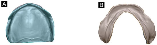 To design a denture base, reference model selection was performed using the following process: according to the classification system from the American College of Prosthodontists, an edentulous maxillary and mandibular cast with class I, type A, residual ridge morphology and no severe undercuts was selected as the reference. The maxillary and mandibular models were scanned, using a tabletop scanner that has <7 microns accuracy to ISO 12836 (Identica T500, Medit, Seoul, Korea) and then exported as a digital file in the Standard Triangulated Language (STL) format. The converted design file was imported into modeling software (Meshmixer, Autodesk, San Rafael, CA, USA), and the maxilla and mandible denture bases were designed based on this edentulous model (Figure 2).