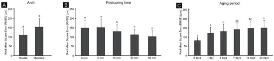 (A) Dimensional difference according to arch position, (B) dimensional difference after postcuring; and (C) dimensional difference, according to model aging period. Different lower-case letters indicate significant differences (p < 0.05).
