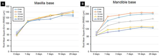 Trueness according to aging period after the printing process in the (A) maxilla base and (B) mandible base.
