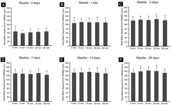 RMSE values at (A) 0 days, (B) 1 day, (C) 3 days, (D) 7 days, (E) 14 days and (F) 28 days after the maxilla printing process. Data are mean and standard deviation values. Different lowercase letters in a single graph indicate significant differences.