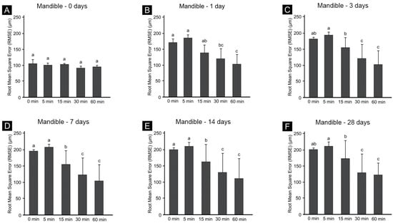 RMSE values at (A) 0 days, (B) 1 day, (C) 3 days, (D) 7 days, (E) 14 days and (F) 28 days after the mandible printing process. Data are mean and standard-deviation values. Different lowercase letters in the same graph indicate significant differences.
