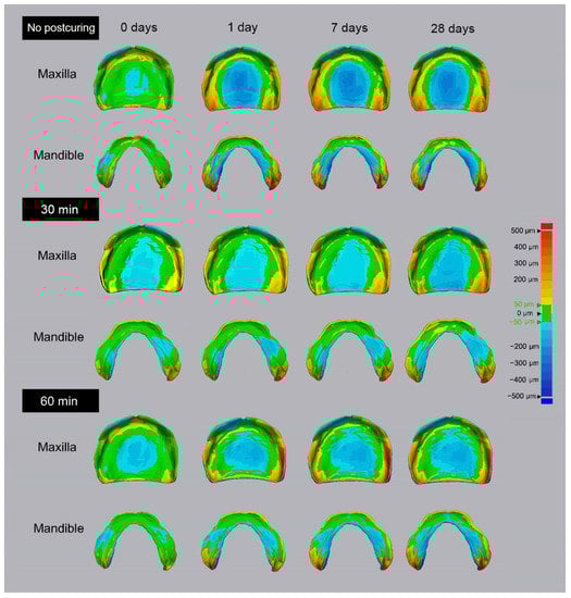 The 3D color map analysis revealed difference in dimensional deformations between the no-postcuring and 60 min postcuring groups (Figure 7). The no-postcuring and 60 min postcuring groups exhibited the most significant dimensional changes, strengthening conclusions regarding their dimensional changes. In both the maxillary and mandibular color maps, the dimensional deformations between days 0 and 1 were remarkable. In the maxilla, lingual contraction of the palatal region and shape deformation around the maxillary tuberosity and hamular notch were measurable from day 1 in both the no-postcuring and 60 min postcuring groups. However, the deformation dimensional was likely to be greater in the 60 min postcuring group than in the no postcuring group. The mandible appeared to be distorted at the mylohyoid muscle and retromolar pad on the lingual side of the posterior region. The mandible also had greater dimensional deformation in the no-postcuring group than in the 60 min postcuring group.