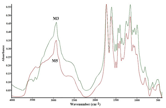 Thermal stability and the DMA ratio affecting the weight loss in hydrogels were investigated by TGA/DTG at 29–594 °C with N2 in the inert atmosphere. TGA thermogram for poly(DMA-co-AAc) hydrogels (M3 and M5) are shown in Figure 5 and Table 3. The thermal degradation for copolymers (M3 and M5) proceeds in three stages. The first weight loss (12.576 wt %) occurred between 29 and 160 °C for M3, (6.76 wt %) was between 30.24 and 209.6 °C for M5 to removing water and moisture. Furthermore, the weight loss increased from 6% to 12%, increasing the ratio of AAc from 30% to 50% in the copolymer, indicating that polyacrylic acid (PAAc) hydrogels could absorb a large amount of water without dissolving [25]. The second and third stages occurred between 160.31 °C and 594 °C for M3 and between 209.6 and 594.5 °C for M5, which was related to the decomposition with losing carboxyl, amid and hydroxyl groups in the copolymers. Thermal stability and initial degradation temperature were at 380 °C, as shown by DTG, demonstrating the stable characteristic of the poly(DMA-co-AAc) copolymers.