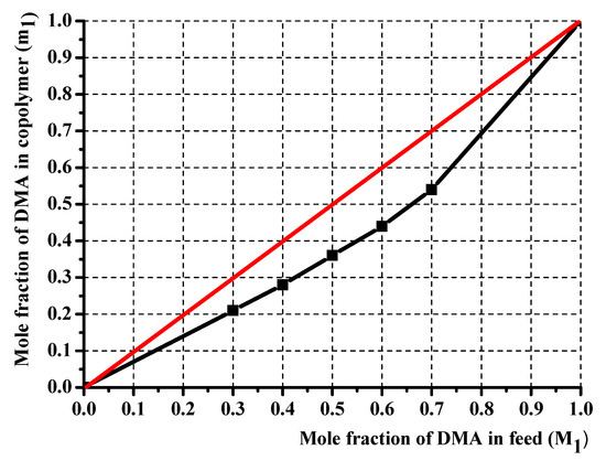The copolymer composition is based on monomers and element feed. Therefore, it is essential to know monomers and radicals’ reactivity in describing the polymerization process. Although the poly(DMA-co-AAc) hydrogels were obtained during the synthesis by the initial monomeric composition, the calculations were performed using element analysis results. One of the poly(DMA-co-AAc) copolymer features is the presence of nitrogen in a single monomer, which allows calculating the copolymer content through the proportion of nitrogen. Thus, we made calculations based on nitrogen. Table 1 shows the influence of the molar fraction of DMA in copolymer (m1), the mole fraction of DMA monomer in (M1) and nitrogen from elemental analysis. The reactivity ratio was investigated by using Fineman–Ross (FR), inverted Fineman–Ross (IFR), Kelen–Tudos (KT) and Mayo–Lewis methods. Table 1 shows the parameters of the FR, IFR and KT equations. The reactivity ratio for DMA (r1) and AAc (r2) from the FR and IFR plot (Figure 2), FT and ML (Figure 3) plot are given in Table 2. The molar fraction of the DMA in the copolymer versus its molar fraction in the feed is shown in Figure 4.