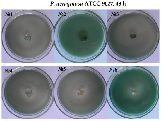 Antimicrobial tests of poly(DMA-co-AAc) hydrogels were studied using GP bacteria (Staphylococcus aureus ATCC 6538-p) and GN bacteria (E. coli (ATCC 25922) and P. aeruginosa (ATCC 9027)) using the disc diffusion method. The composition (for staphylococcus aureus) of the nutritional agar was as follows (g/L): meat extract 1.5; sodium chloride 5, yeast extract 1.5; peptone 5; agar 15.0; pH 7.4–7.6. Incubation of test organisms with applied copolymers was carried out in the thermostat (Binder) at 37 °C for 24 and 48 h. The antimicrobial activity of the hydrogels was determined by measuring the diameter (in mm) of their inhibition zones to microorganisms’ growth. Photo documents confirmed the results of the studies.