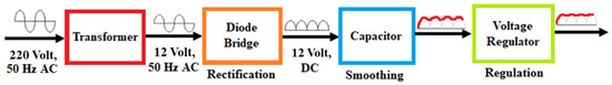 The electrical circuit for the mechanism is shown in Figure 2. The circuit comprised a transistor, capacitors, a few resistors, and several diodes. Firstly, the power supply from mains switch board was stepped down by a transformer and converted to a 12 Volt AC wave. This wave was then sent to the diode bridge for rectification. The diodes acted as valves that allowed only one type of polarity of the wave to pass through them and rejected the other type. These diodes were connected in the form of a bridge to polarize the AC wave, thus converting into a fluctuating DC wave. The diode bridge ensured that no part of the wave was left unutilized. If one type of polarity was rejected by a diode, another diode present in the diode bridge accepted that part of the wave, thus utilizing the full wave during rectification. This fluctuating DC wave was then smoothened using a high-value capacitor. The capacitor was charged during the on cycle and did not discharge suddenly during the off cycle. Hence, this gradual discharging smoothened the voltage cycle to an extent. Further voltage ripples were reduced using a voltage regulator containing Zener diodes. These are special type of diodes with a voltage limitation, known as a Zener voltage. If a voltage across the Zener diode exceeds the Zener voltage, its ability to act as a valve collapses; i.e., the current begins to flow in both directions. This ability helped in straightening the DC wave. Apart from this, the circuit had two small-sized capacitors, which helped to prevent noise.