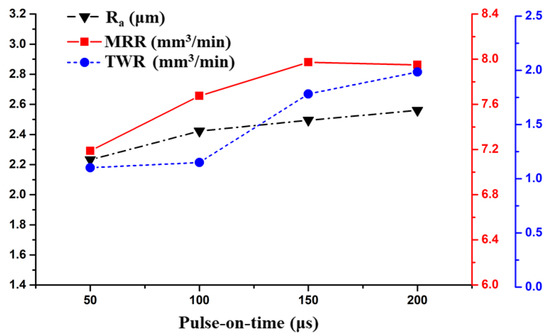 Figure 4 also shows the effect of Ton on the Ra. The Ra value increased with Ton during the machining process. The Ra increased from 2.2 to 2.4 µm when the pulse-on-time changed from 50 to 100 µs. Later, the increase in Ra was almost linear from 2.4 to 2.6 µm when the pulse interval grew from 100 to 200 µs. The Ra increment in the former pulse duration was greater than the subsequent duration. This was because, as the pulse duration increased, the size of the plasma channel increased, which decreased the energy density, resulting in the decrease in the size of the craters formed on the work piece thus reducing the surface roughness [24].