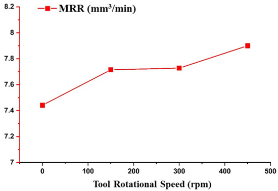 The effect of tool rotational speed was investigated on MRR and is depicted in Figure 7. The TRS only significantly affected the MRR and by varying the motion of the tool from stationary to rotating at 500 rpm, the MMR increased from 7.4 to 7.9 mm³/min. A similar observation has been reported by various researchers [37,38,39]. Due to the increase in TRS, the centrifugal force experienced by the debris in the spark gap increased. This resulted in the effective removal of the debris, thus decreasing the short circuiting of the pulses. It also increased the effective discharge ratio, which helped to increase the MRR.