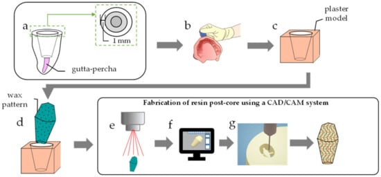 Fabrication of (a) CAD/CAM post-core a: Preparing a post hole; (b) Taking impression of the prepared tooth; (c) Making a working model from the impression; (d) Making a wax pattern of a post-core on the working model; (e) 3D scanning the working model and the wax pattern; (f) Designing a 3D digital post-core; (g) Milling TRINIA into a shape of the post-core.