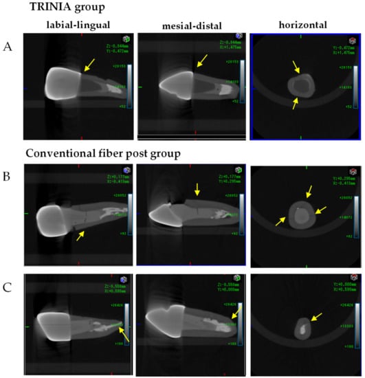 Micro-CT images of the bovine roots restored with fiber-reinforced post-cores and zirconia crowns. In the TRINIA group (A), all the specimens were fractured in the cervical and middle areas. In the conventional fiber post group, 37.5% of fractures occurred in the cervical and middle areas (B), and 50% were in the apical area (C). Arrows indicate fractures.